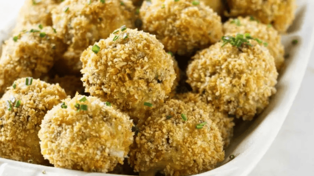Loaded baked potato croquettes, made of mashed potatoes, crisp bacon, chives, cheddar cheese, rolled in bread crumbs and baked to a crispy golden brown.