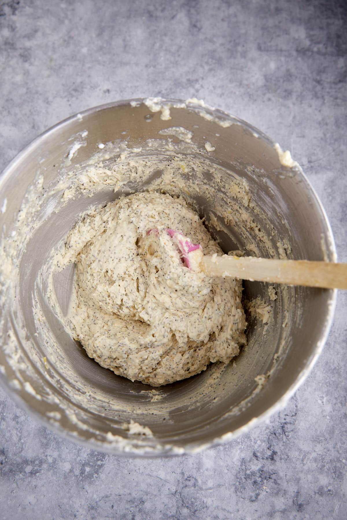 Using a stand mixer, beat the sugar and butter until creamy then add eggs one at a time. Beat each egg until combined before adding the next. Add your wet ingredients, fresh lemon juice, and fresh lemon zest, and mix until combined.