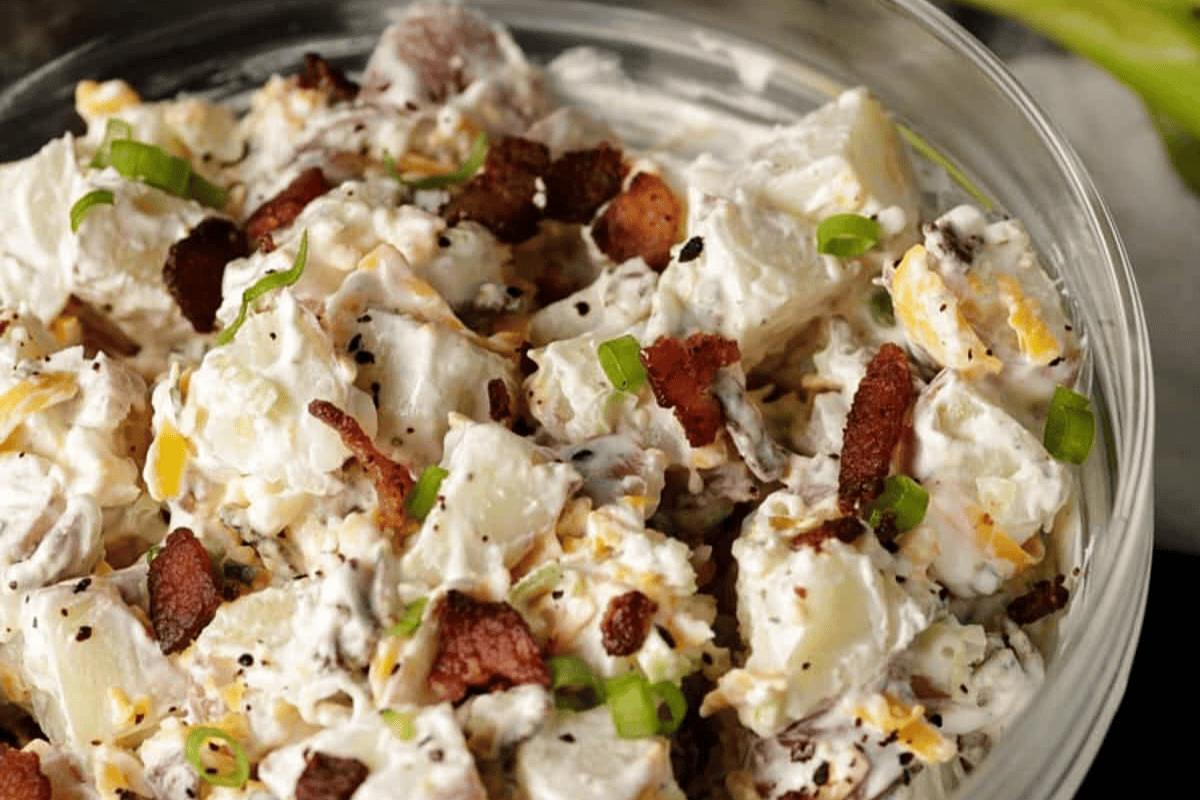 This Ranch potato salad with bacon, cheese and a sour cream ranch dressing is just what you need for a potluck or cook out. All the flavors of a loaded baked potato plus a flavorful dressing to coat tender new potatoes.