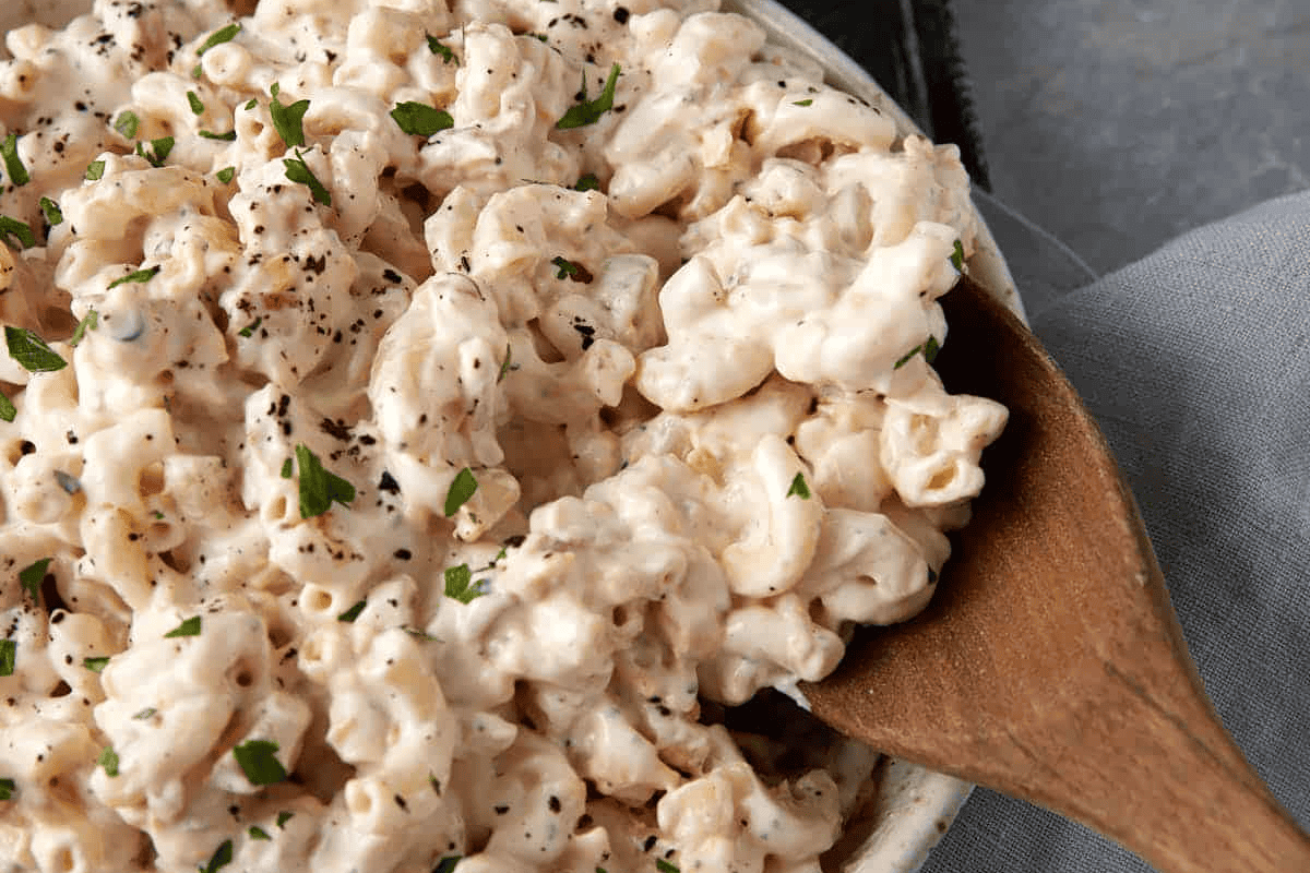 A combination of both sour cream and mayonnaise create the creamiest Southern macaroni salad around. A hint of sweet and sour along with grated cheese makes this the star of any potluck or cook out. A fantastic make ahead summer salad that gets even better after a day in the fridge. No mushy bland salad here!