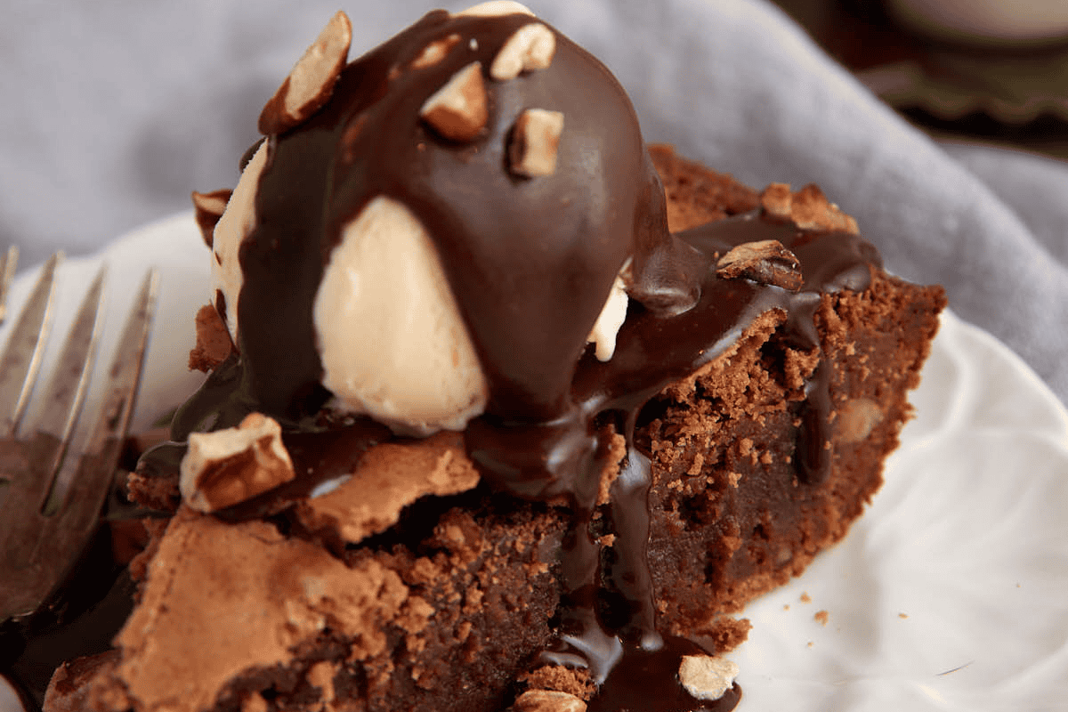 Calling all chocolate lovers, this dessert is like a super fudgy brownie in pie form. No pie crust required for this rich and decadent Brownie Pie. The soft, moist, and chewy brownie filling has an unexpected touch from toasted pecans! Top it off with melty chocolate and serve warm with a scoop of vanilla ice cream. It’s like a brownie sundae.