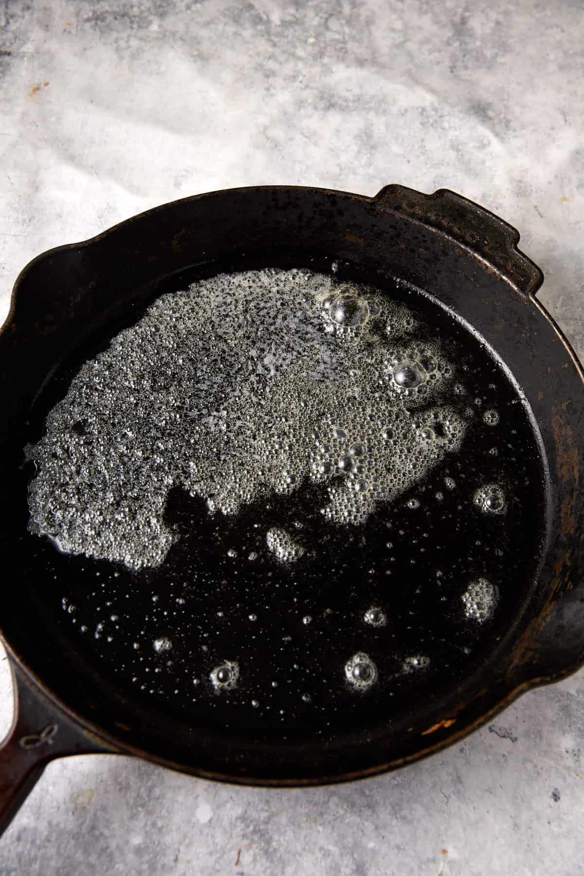 - Preheat oven to 400º and place a 9-inch cast iron skillet in the oven as it heats up.