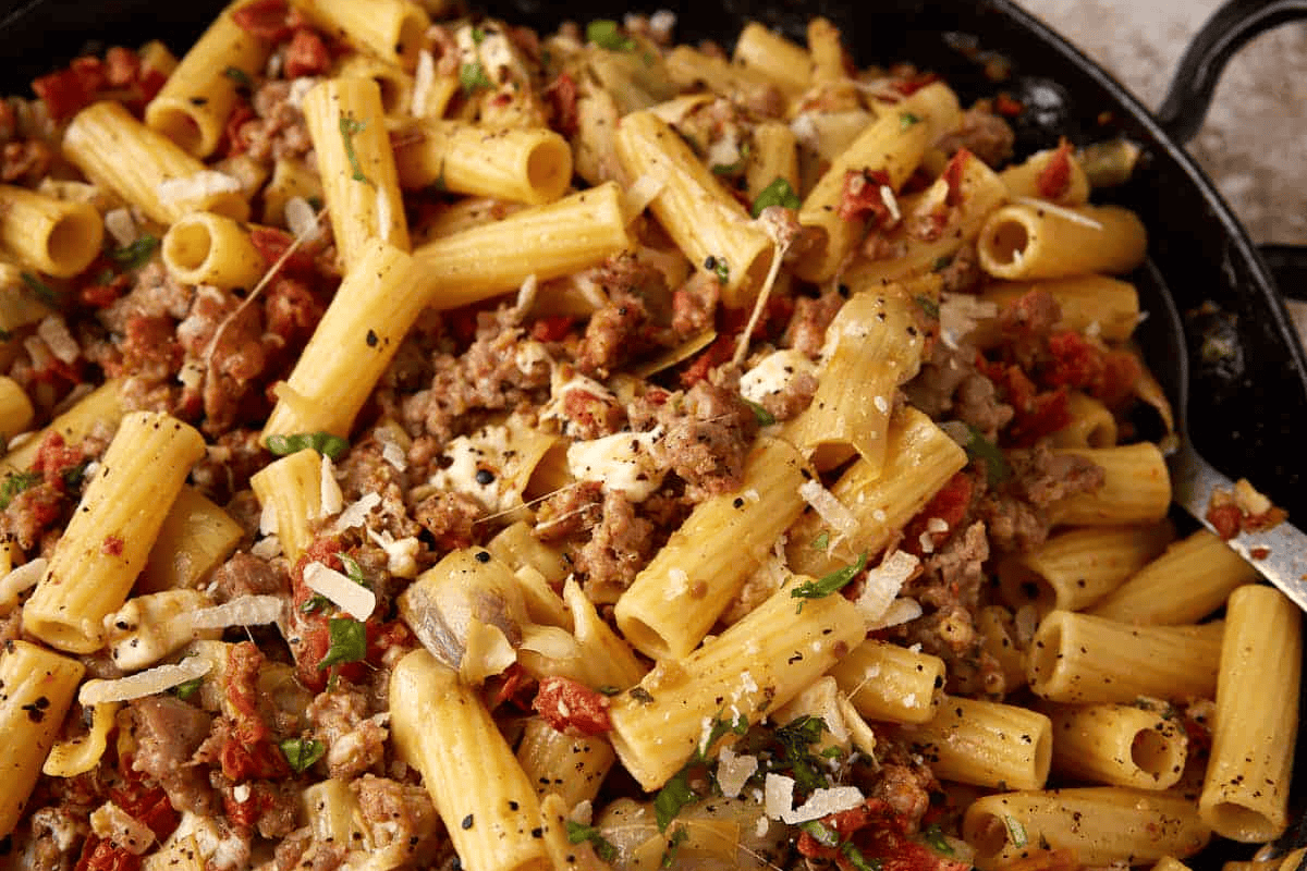 Enjoy a quick and easy pasta dish that brings together the robust flavors of sun-dried tomatoes, savory Italian sausage, and creamy melted mozzarella cheese. Each bite has the rich flavor of sun-dried tomatoes complementing the sausage, while the melted mozzarella adds a little creaminess that ties it all together, making it an amazing 30 minute pasta dinner.