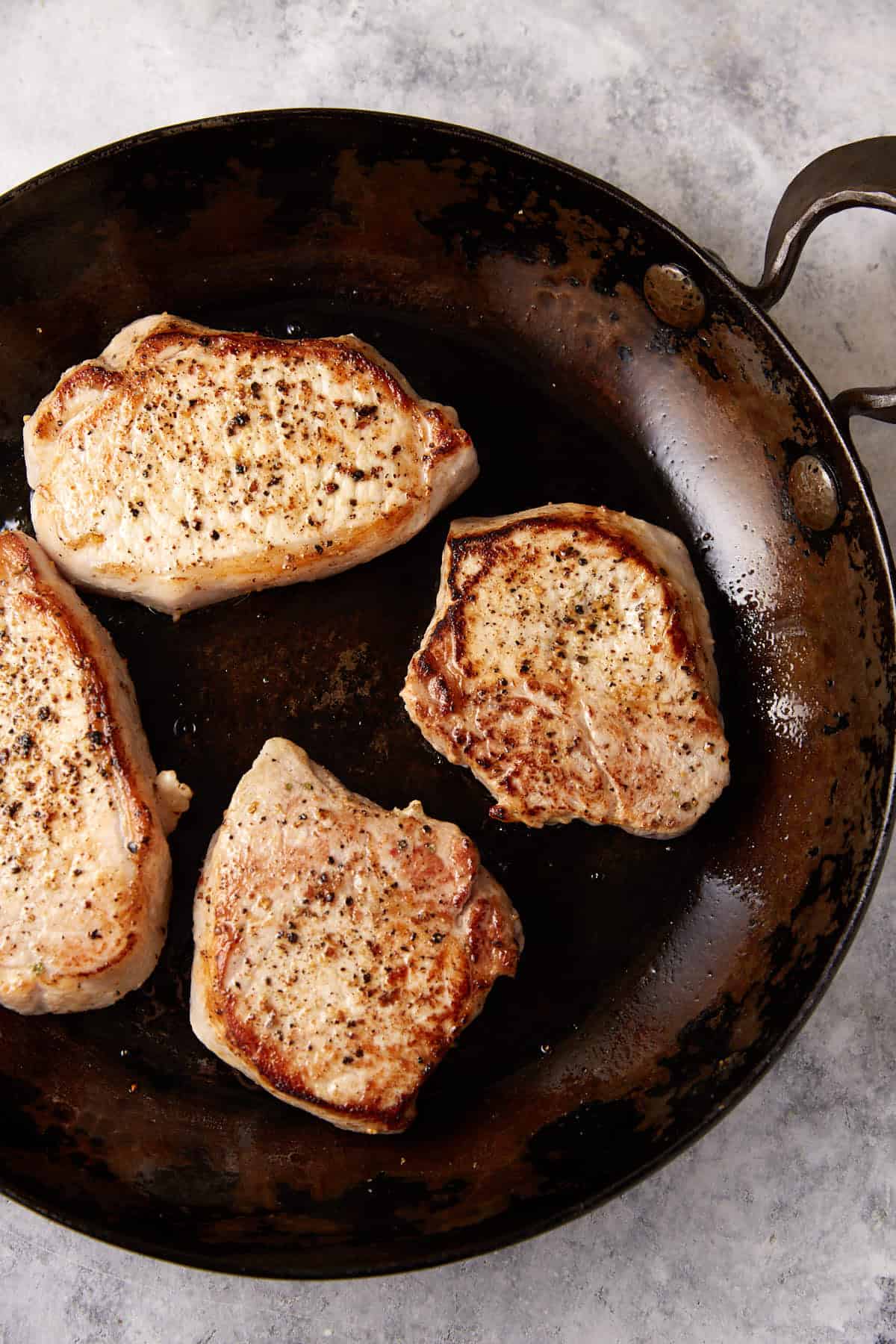 Heat a large cast iron skillet over medium heat and add olive oil. When the oil shimmers, add pork chops and cook for 2-3 minutes per side or until golden brown. Remove from the pan and set aside.