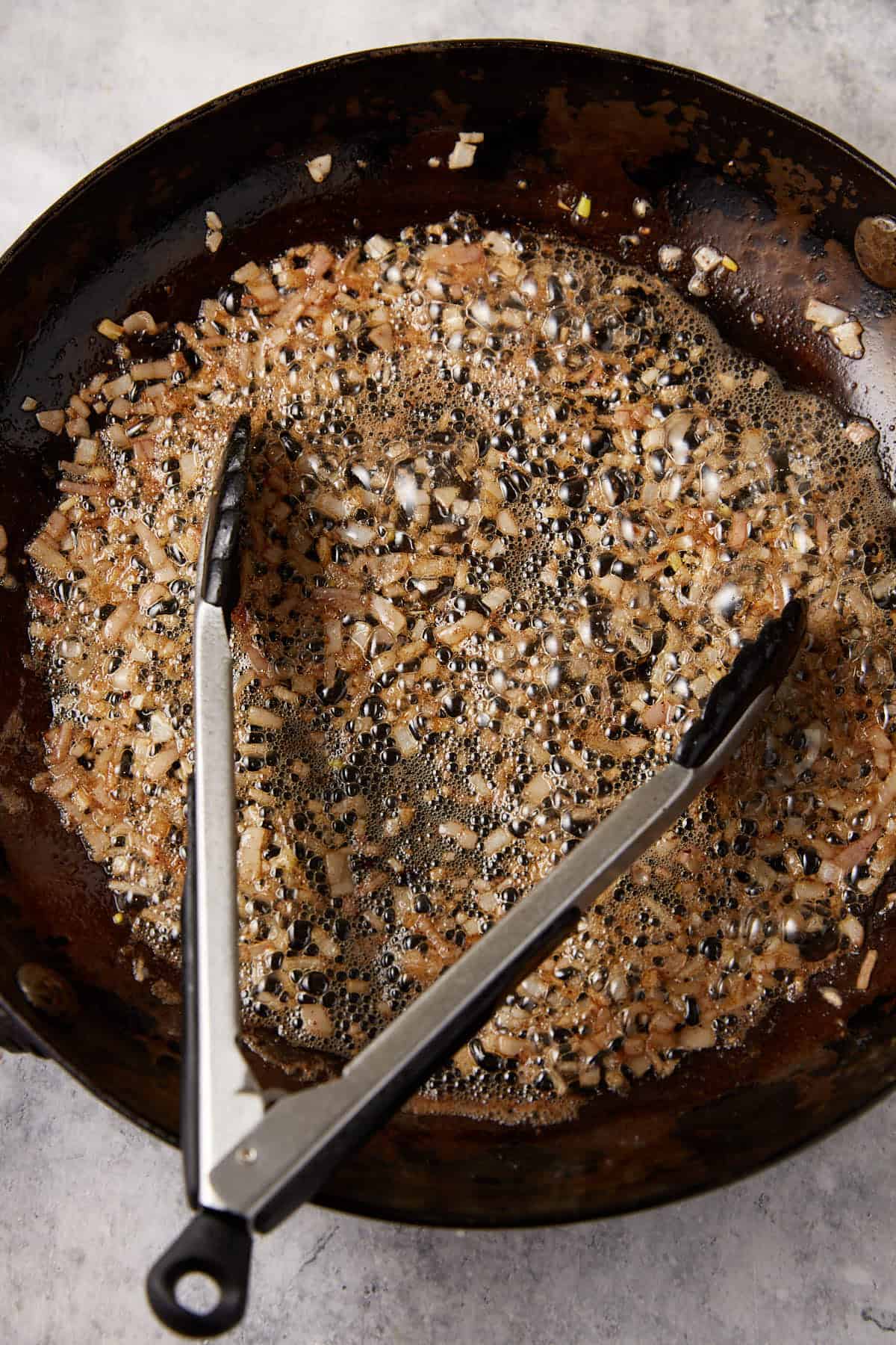 Add butter and chopped shallots to the pan and cook until softened. Then whisk in flour and cook for one minute. You want to make sure there is no lingering raw flour taste in your gravy!