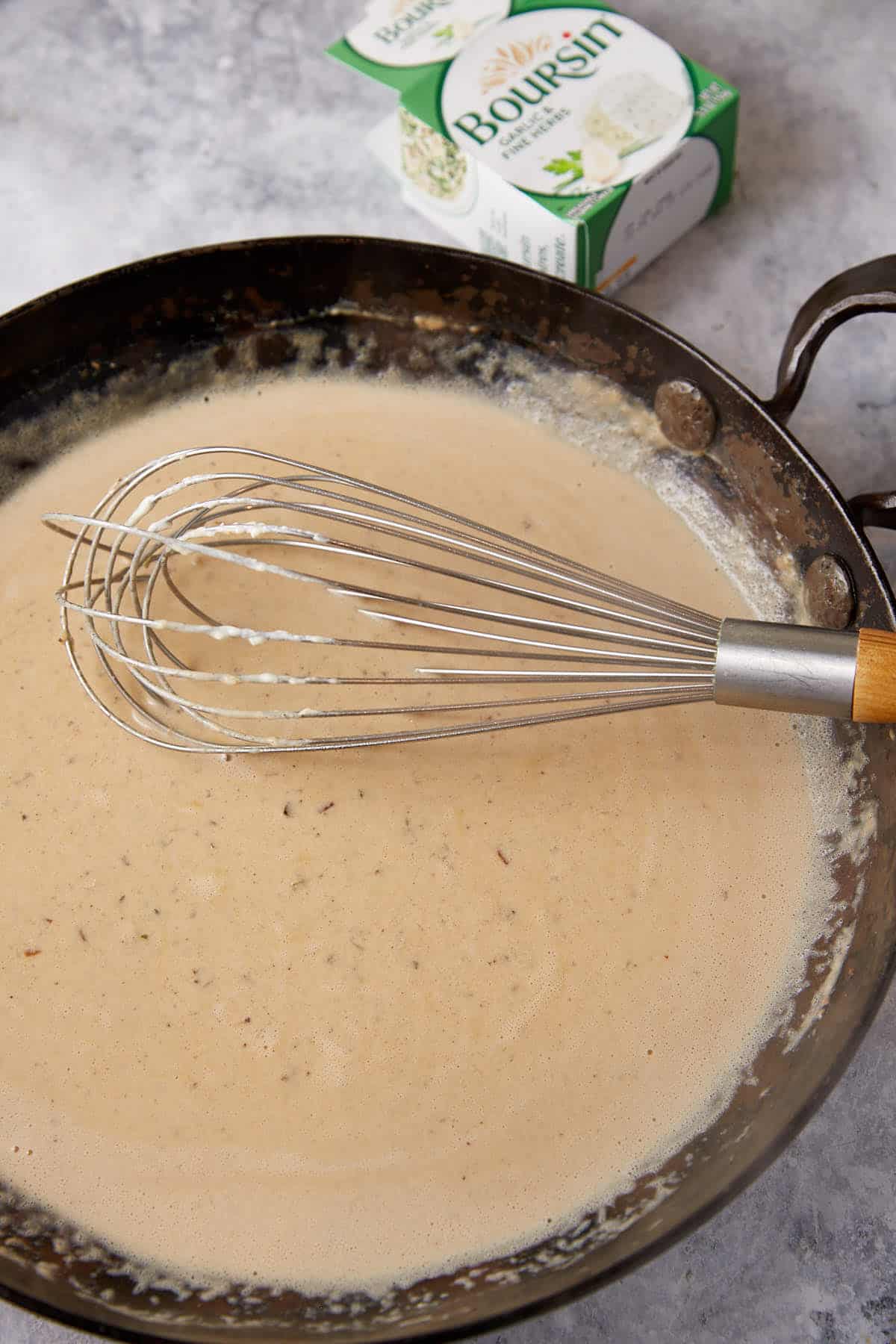 Slowly add chicken broth to the pan, whisking until it thickens. Make sure to scrape up any browned bits from the bottom of the pan, as that’ll add more flavor to your gravy. Add Boursin cheese and whisk until fully incorporated.