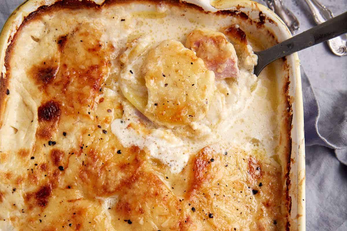 Scalloped potatoes and ham is a comforting casserole of potatoes and tasty chunks of ham in a creamy white sauce under a layer of gooey gruyere.