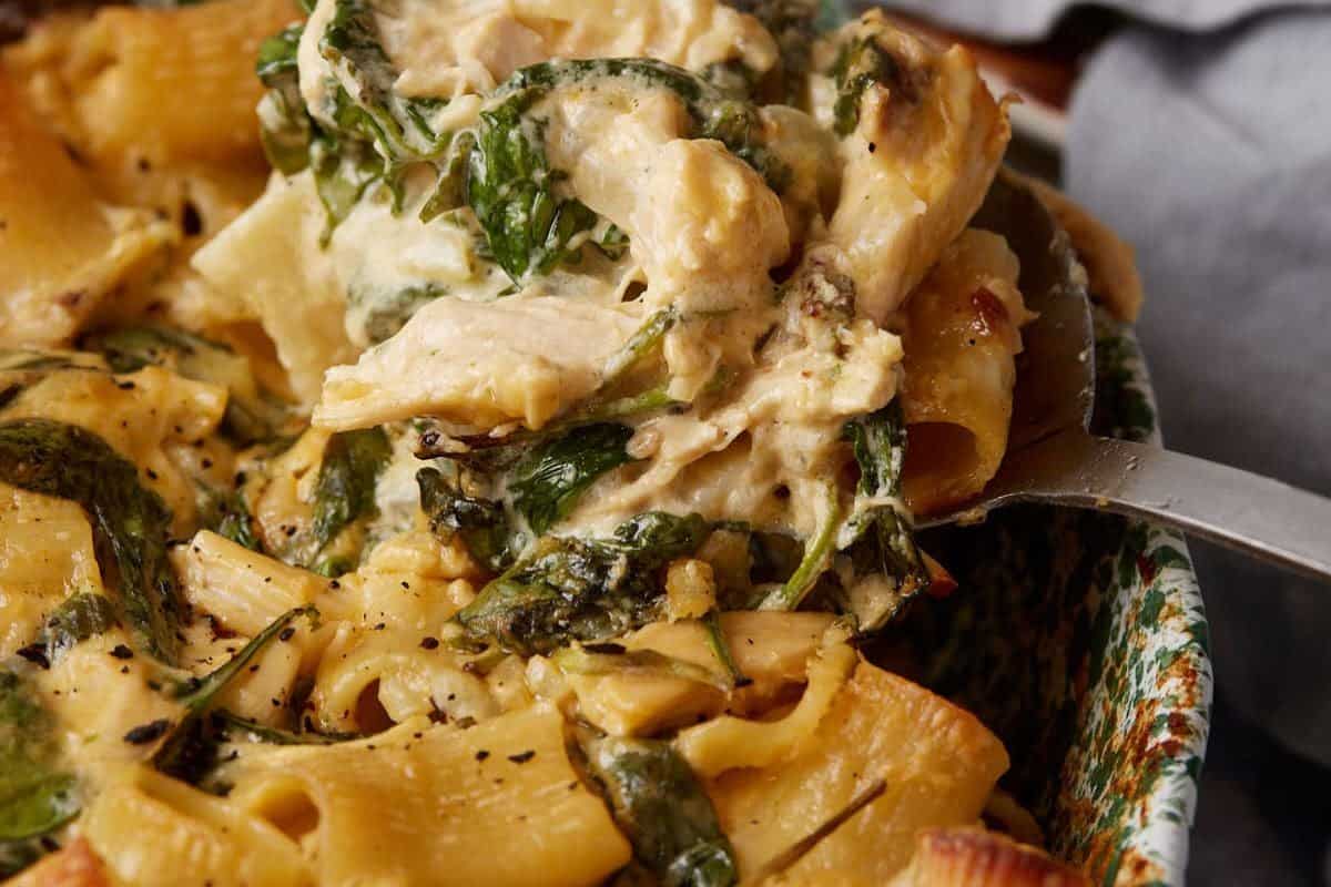 This Cheesy Chicken Mac is less like mac and cheese and more like a casserole with its creamy sauce, tender chicken, and fresh spinach.