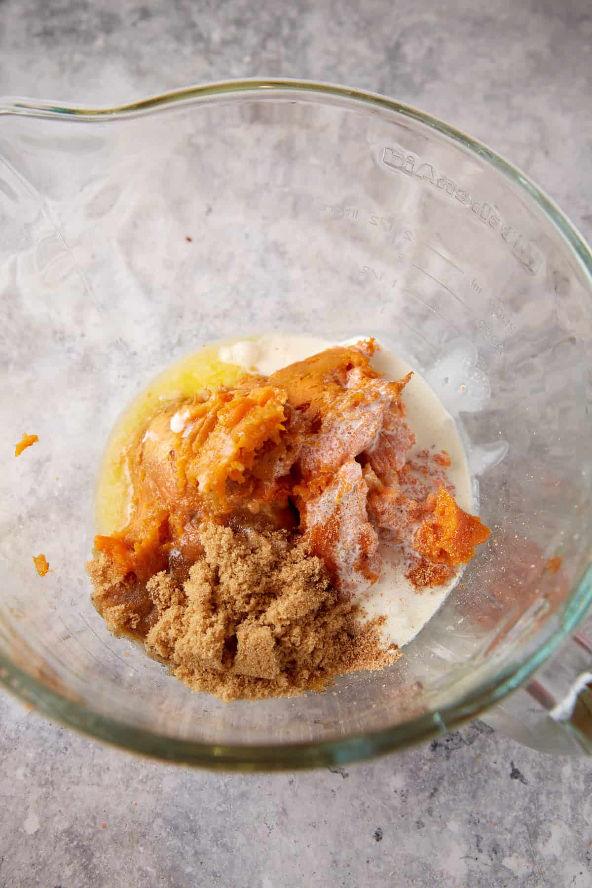Remove the potato skins and add them to a stand mixer bowl. Beat until smooth with melted butter, brown sugar, nutmeg, vanilla extract, and cream. Add bourbon and mix to combine. If you don’t have a stand mixer, you can also use a large bowl and an electric hand mixer, or use a potato masher.