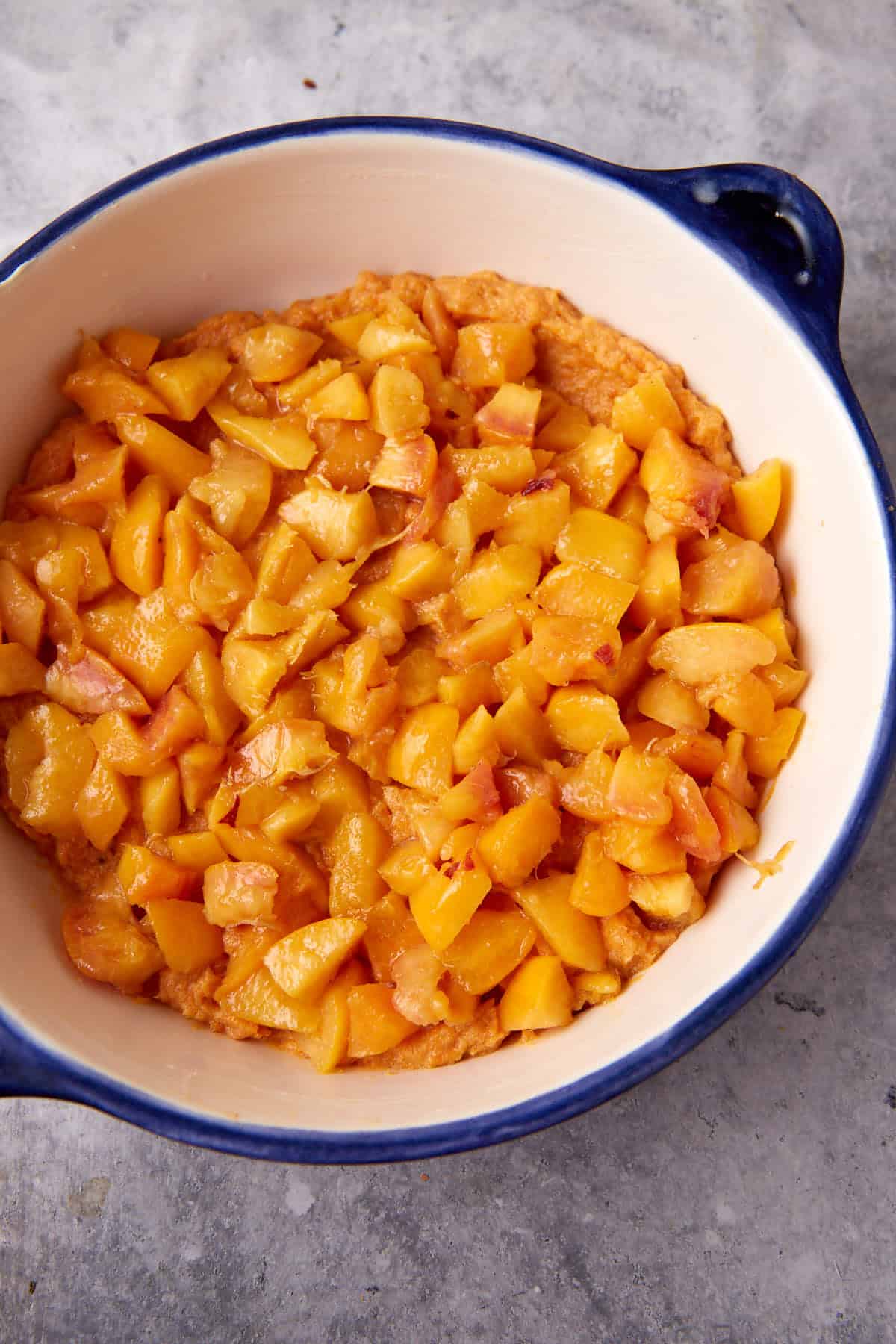 - Place half of the sweet potato mixture in the bottom of the baking dish. Top with diced peaches, and then add the remaining sweet potatoes. Smooth to even the surface.