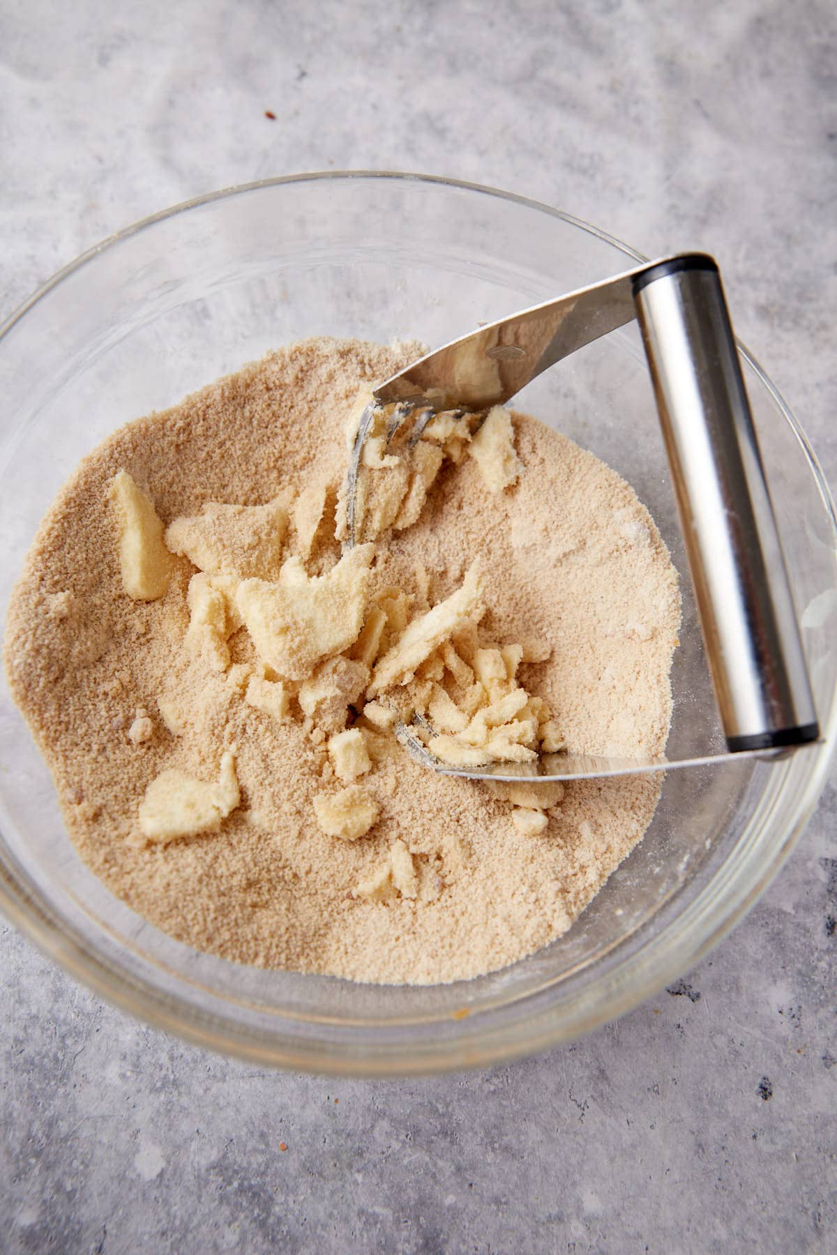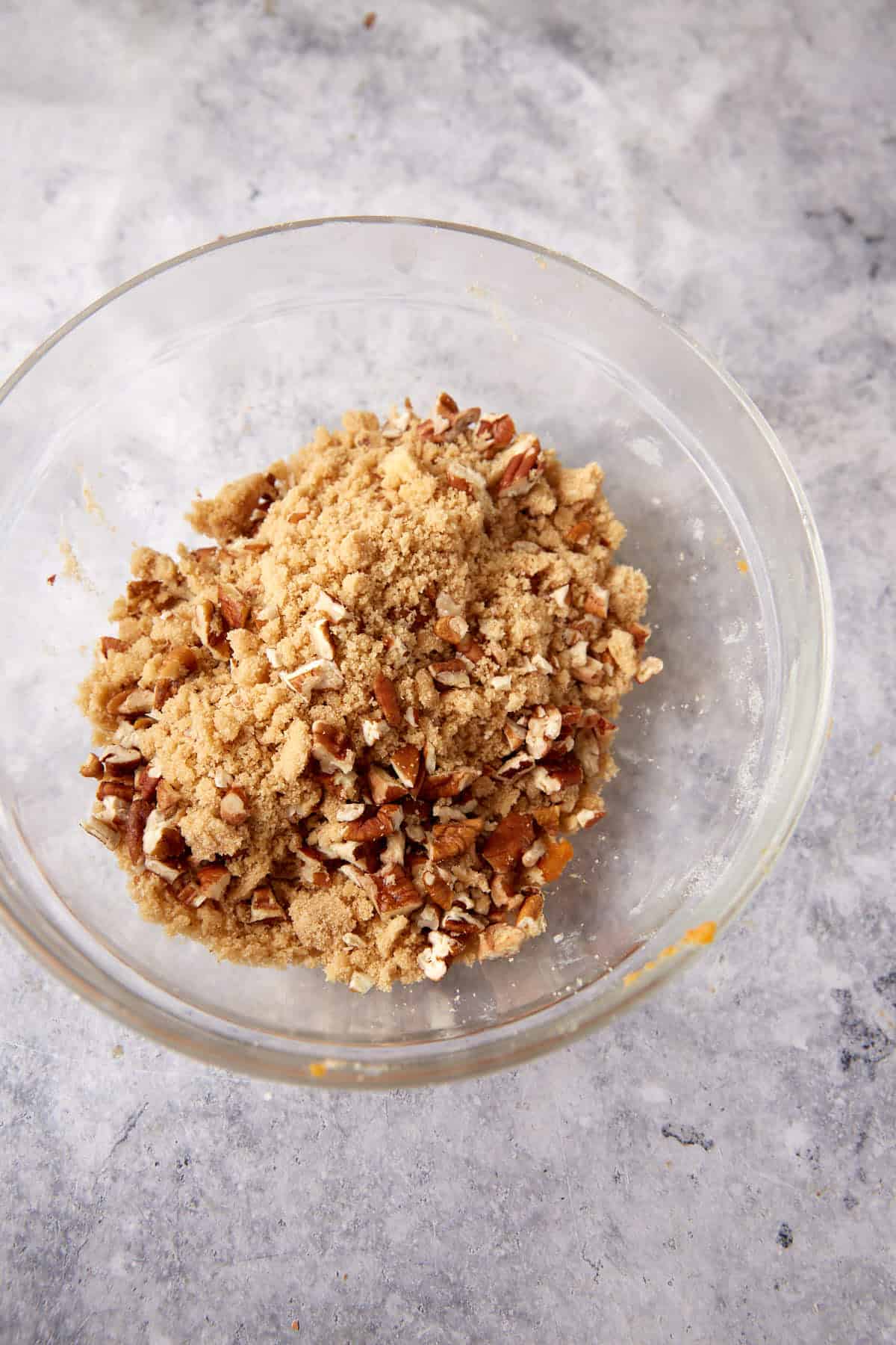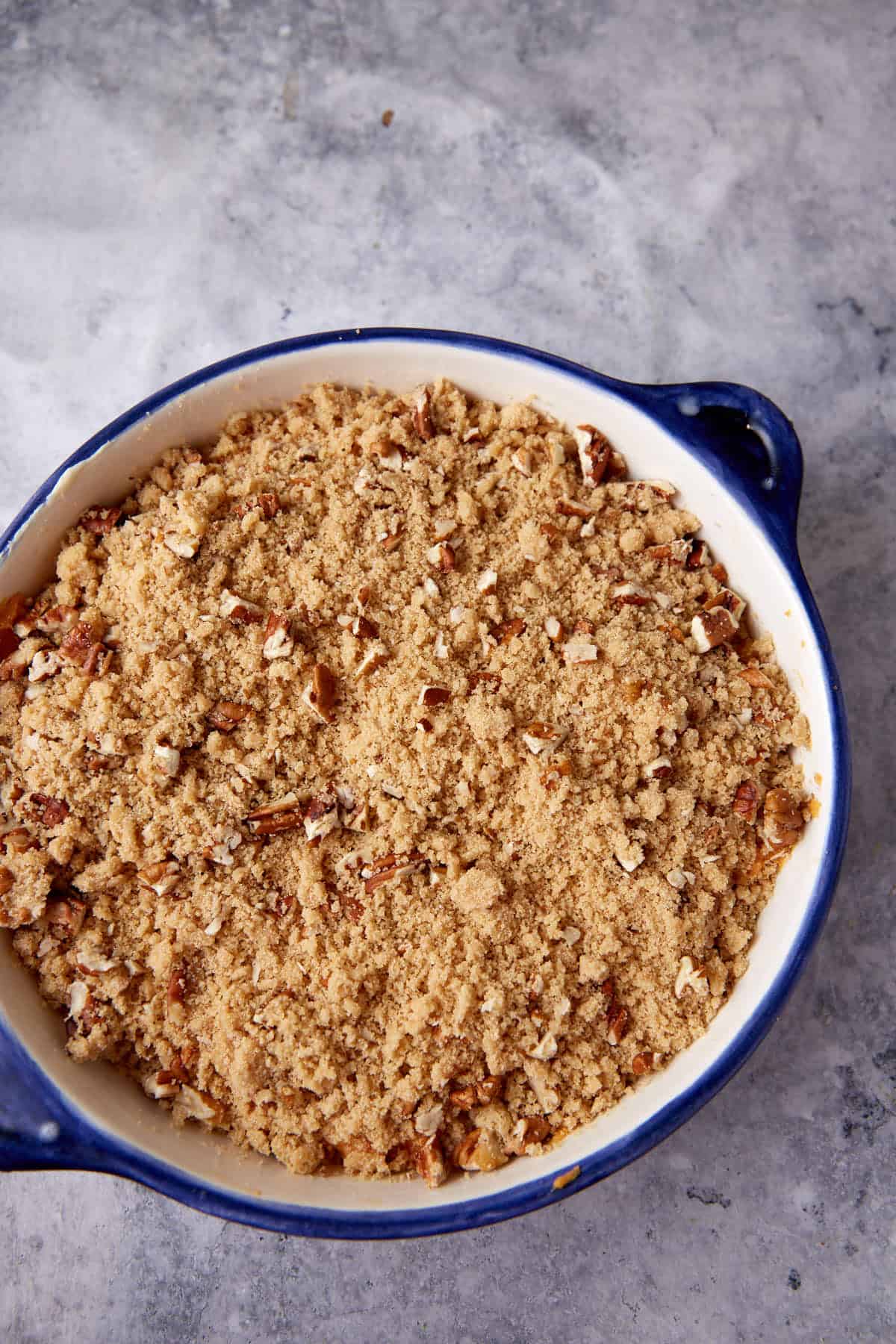 - In a medium bowl, combine the brown sugar and flour. Add the softened butter and combine with a pastry cutter or your fingers. Once combined, add nuts. Sprinkle over the top of the baking dish.
