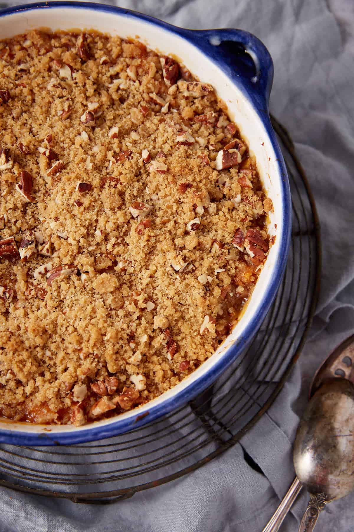 Full of flavor and perfect for making ahead, this homemade sweet potato casserole gets a tart summer twist with the addition of ripe peaches. Enjoy smooth, creamy sweet potatoes topped with a crunchy, toasty, praline-esque pecan topping. After cooking the sweet potatoes and layering with peaches, you throw it in the oven for 30 minutes or until the topping gets all brown and bubbly.