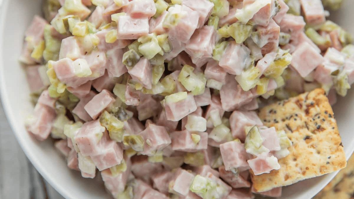 A classic chunky Ham Salad recipe with ham, pickles, onion, and celery all mixed together with mayonnaise and seasoned with salt and pepper!