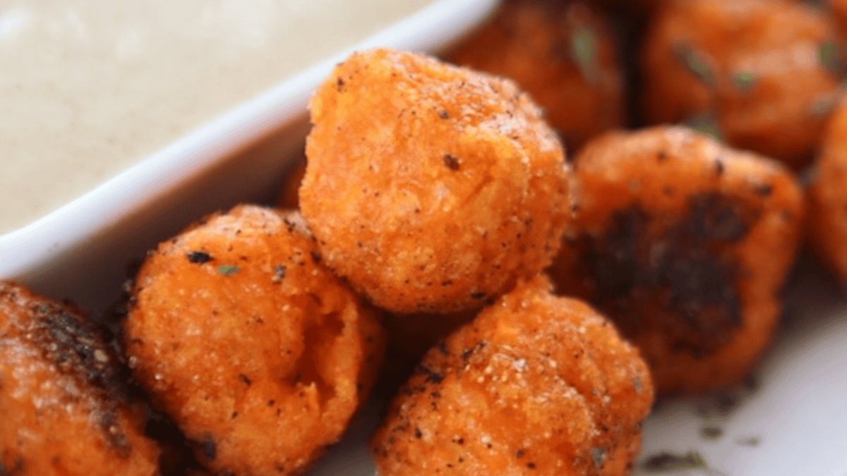 Frozen sweet potato tots, tossed in cajun seasoning, is a crisp and tasty appetizer that pair deliciously with creamy cinnamon dip.
