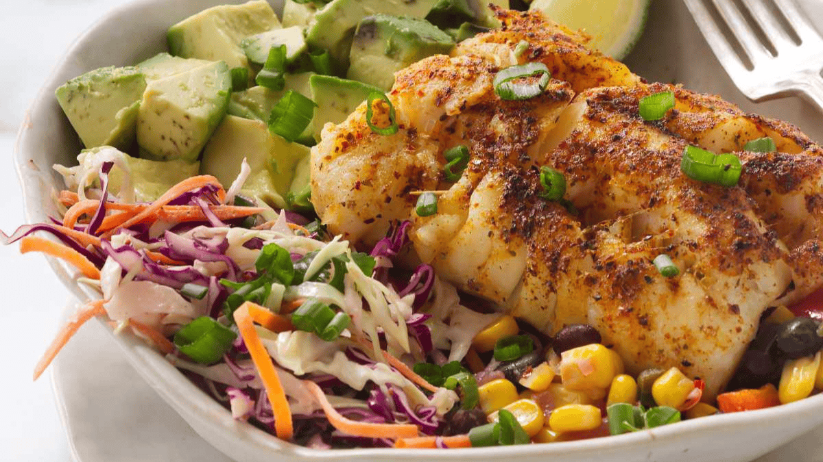 Bold Baja Fish Taco Bowls with flaky cod, zesty slaw, smoky salsa, and creamy avocado. A quick cod taco bowl that makes dinner feel special!