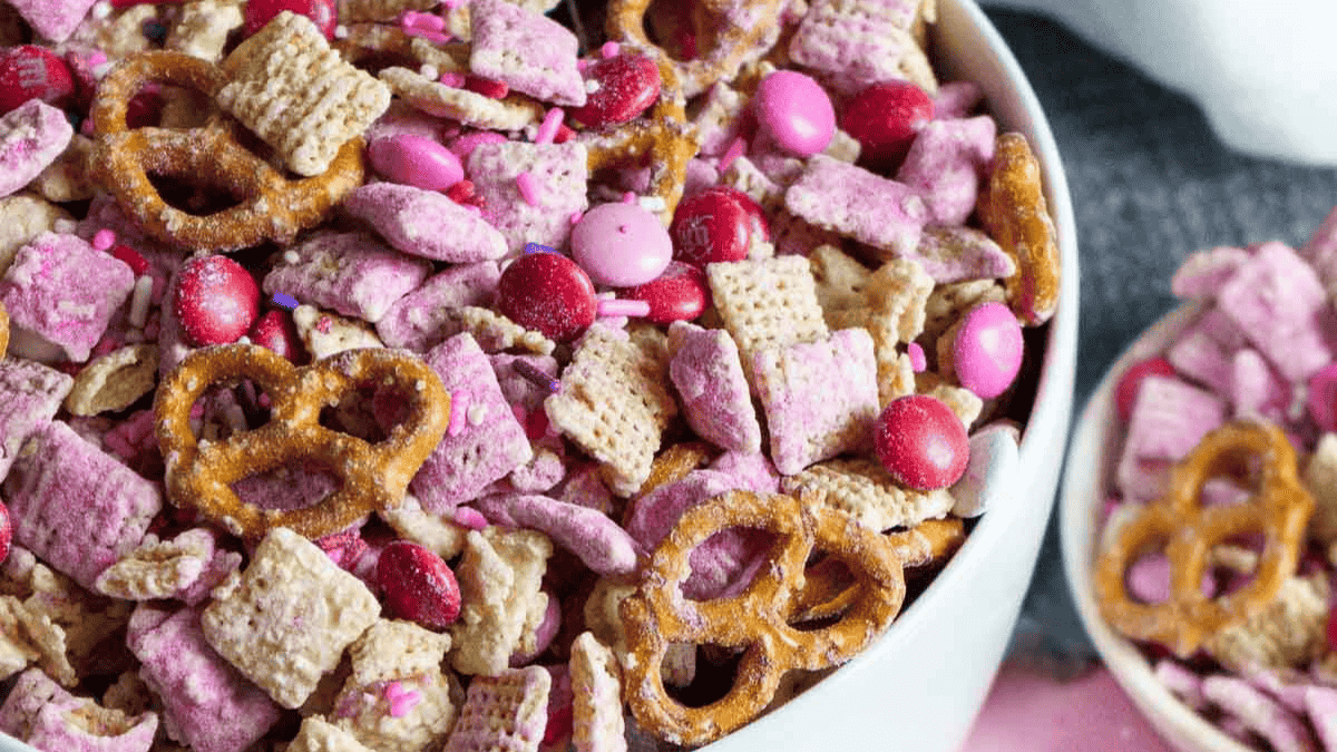 Get the Recipe: Easy Pink Valentine Puppy Chow Chex Mix