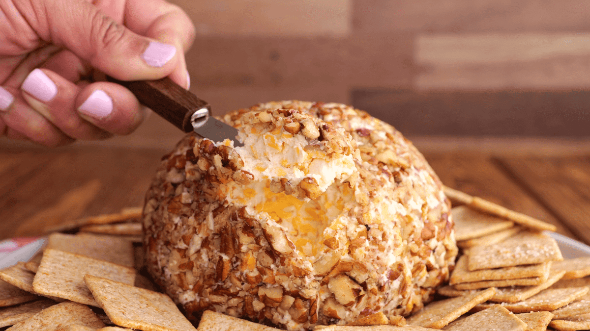This cheese ball recipe is made with three different types of cheese and seasonings, wrapped up in a smooth ball covered in pecan pieces.