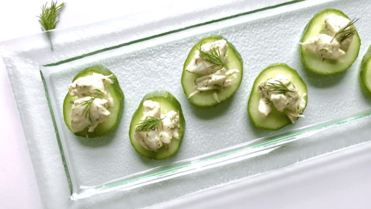Delicious Jumbo lump crab meat lightly dressed with a fresh, creamy lemon dill sauce with shallots and dijon mustard, all perched on top of crisp cucumber.