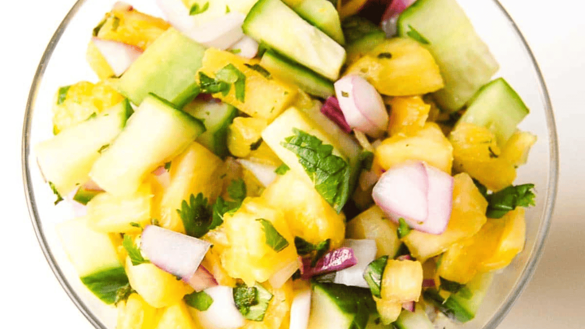 Pineapple Relish with cucumber and mint is the perfect topping for grilled meats and steamed veggies. Or you can snack on it for a healthy and tasty appetizer.