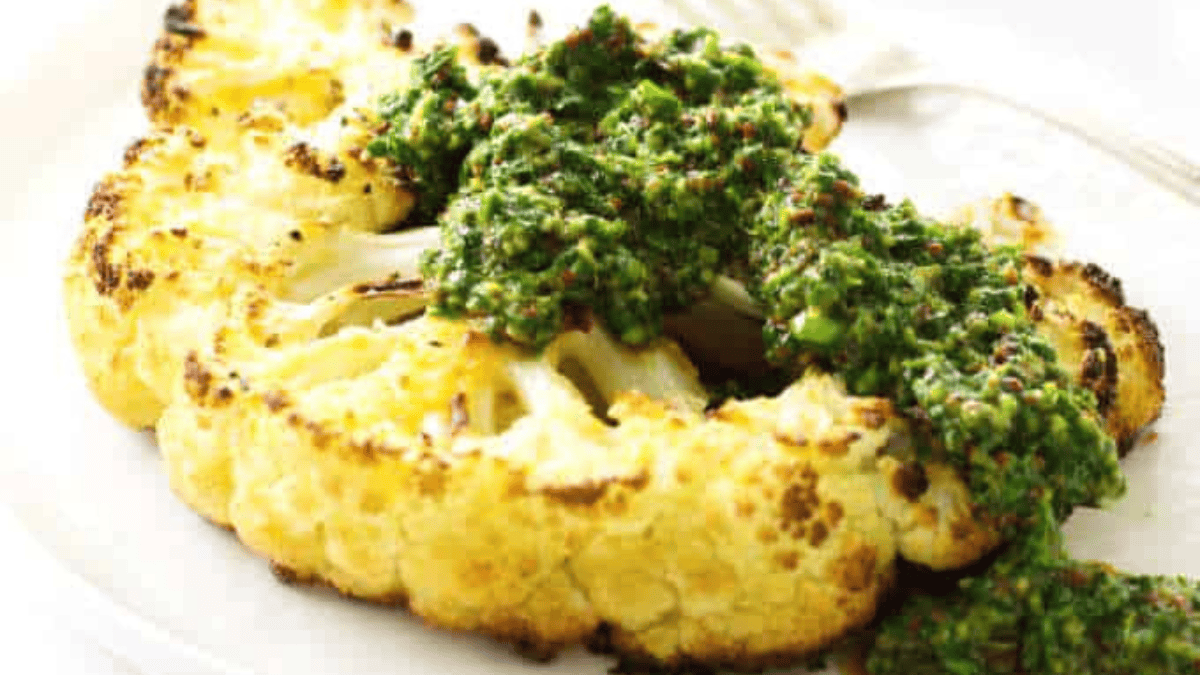 A coating of garic butter gives these roasted cauliflower steaks the crisp edges and great flavor. Each steak is topped with freshly made chimichurri sauce.