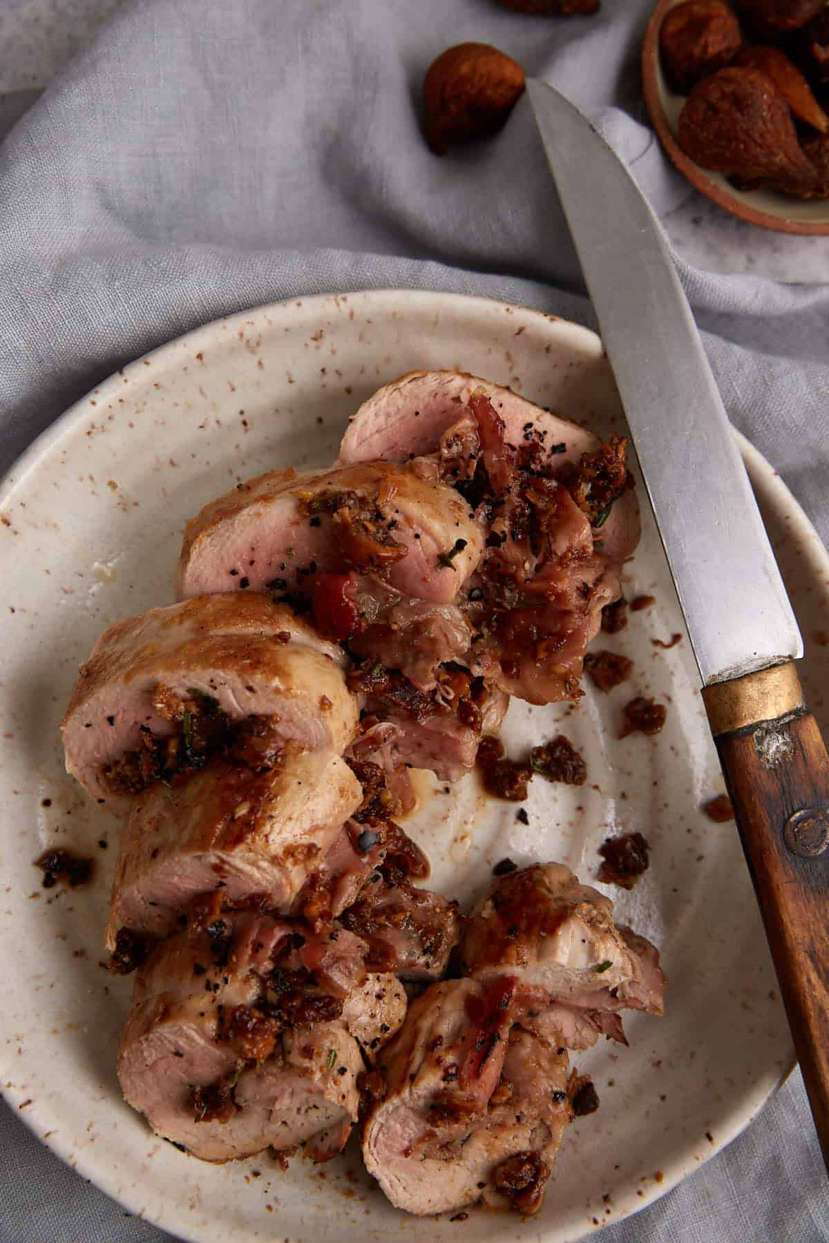 – butter – dried figs – fresh rosemary – garlic – pork tenderloin – prosciutto – olive oil