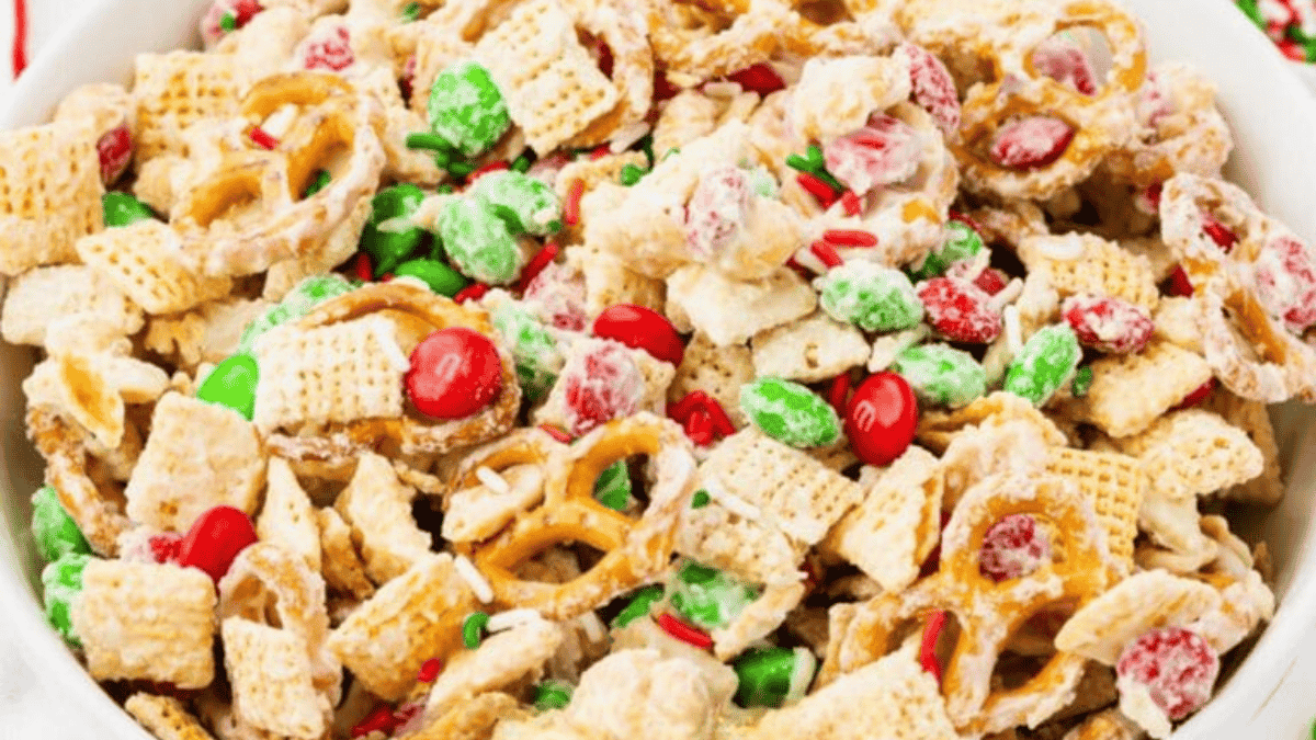 This White Chocolate Christmas Chex Mix recipe combines crunchy cereal, pretzels, peanuts, and festive M&Ms for an irresistible treat.